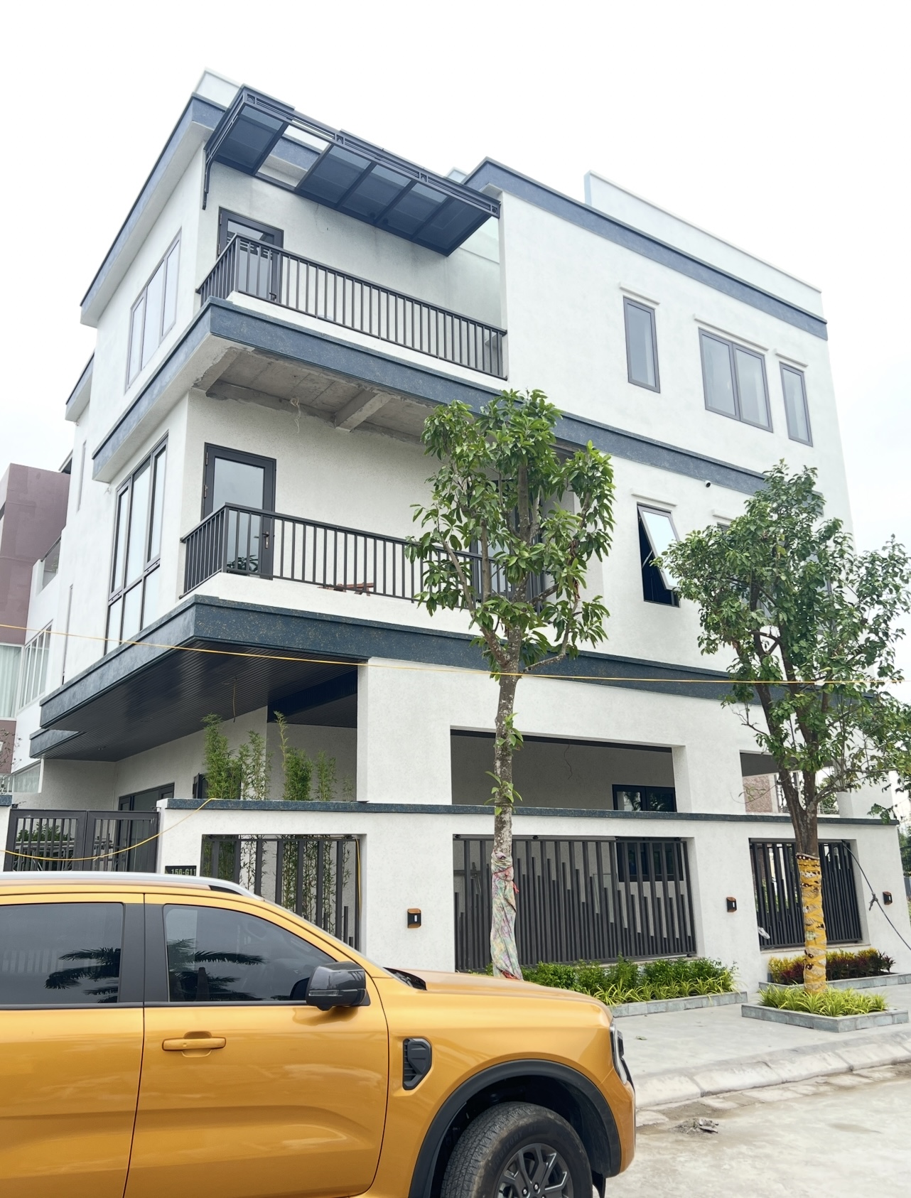 Các ban công rộng rãi cùng mái che kính hiện đại không chỉ tăng tính thẩm mỹ mà còn giúp bảo vệ công trình khỏi tác động của thời tiết.